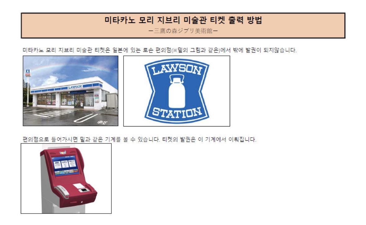 티켓은 QR 코드로 로손에서 미리 교환해야 하며 미술관 근처에도 로손이 있어 당일 발권도 가능합니다 ( 기계에서 뽑은 후 카운터로 가져가셔야 직원 분이 티켓으로 발권해 주십니다)